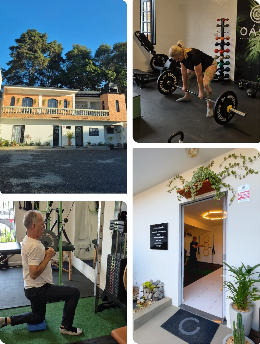 Rodeada por natureza, o Oásis é mais do que um estúdio de Pilates, Funcional, Musculação, Fisioterapia e Massagem. É um refúgio. Um lugar onde o exercício vira pausa, o treino vira encontro e o resultado vem como consequência de um corpo cuidado com carinho.